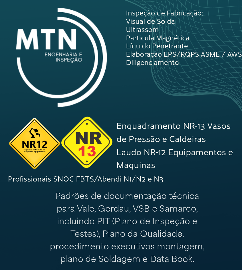 Na MTN Engenharia e Inspeção, somos referência em Engenharia e Inspeção Industrial, com especialização nas normas NR-11, NR-12 e NR-13. Nossa equipe de profissionais altamente qualificados oferece serviços de inspeção de soldagem com certificações SNQC IS-N1 e N2, ASME, AWS e API.